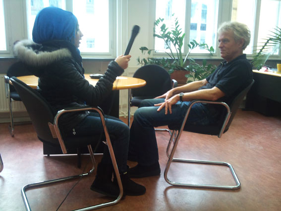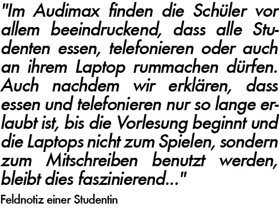 Tag an der Uni Marius Mailänder „OK, und wie stellt ihr euch die Uni eigentlich vor?“ „Hmm, auf jeden Fall größer als die Schule, aber keine Ahnung.“ Es ist Mittwoch, der dritte Tag der Projektwoche, und wir stehen kurz davor, mit einer sechsköpfigen Schülergruppe in Richtung Humboldt-Universität aufzubrechen. In der Vorbereitung, einen Tag zuvor, haben die Schüler noch Fragen zur Uni gesammelt, den einzelnen Fächer und ganz allgemein über das Studentenleben: „Ist das da sehr schwierig?“, „Welche Fächer habt ihr?“, „Wie lange machst du das schon?“, „ Was macht man damit mal?“, „Habt ihr auch eine Klingel an der Uni?“, „Gibt's dafür Geld?“ Als erste Station steuern wir direkt das Grimmzentrum, die neue Zentralbibliothek der HU an. Wir führen sie flüsternd durch die Gänge. Die Schüler sind von der Größe des Gebäudes, der repräsentativen Architektur und der schieren Masse von Büchern sehr beeindruckt. Noch viel mehr fasziniert sie aber die Tatsache, dass „hier alles so frei rumsteht“. „Hier passt ja gar keiner auf... Kann man die einfach so nehmen, die Bücher?“ Ratlose Blicke. Yussuf zieht zur Probe eines der Bücher aus einem Regal. Eine dicke Staubschicht liegt auf dem dicken, alten Wälzer. Er braucht nur den Bruchteil einer Sekunde um zu begreifen, welch verlockende Möglichkeiten dieses verstaubte Buch bietet. Mit dem Überraschungsmoment auf seiner Seite bläst er Nader eine dicke Staubwolke ins Gesicht. Alle sind amüsiert, nur einige der Bibliotheksbenutzer nicht. Pssst. Wir verkneifen uns das Lachen, und wollen weiter, aber natürlich muss Nader erst noch Rache üben und Yussuf mit einem weiteren Buch einstauben. Gekicher. Pssssst. Der Weg zum Ausgang führt uns im Erdgeschoss durch die mit Sesseln und Sofas ausgestattete Lounge, in der zur allgemeinen Begeisterung zwei Bibliotheksbenutzer eine Schlafpause eingelegt haben. „Man kann hier schlafen? Ist das erlaubt? Krass!“ Sofort schmeißen sich zwei der Schüler auf freie Sessel und imitieren das Beobachtete. Schnarchend und kichernd natürlich. Sie stellen auch Theorien auf, warum die Studierenden hier schlafen müssen: „Die lernen so viel und das macht ja dann voll müde“. Alle stimmen zu, so wird es sein. Wir verlassen die Bibliothek und ziehen weiter. Wir haben die Schüler an diesem Tag durch die verschiedenen Etagen und Räume des Instituts für Europäische Ethnologie geführt. Sie haben engagiert Interviews geführt und Beobachtungen aufgezeichnet. Die größte Begeisterung löste aber Felline, die Hündin einer Institutsmitarbeiterin, aus: „Was? Hunde dürft ihr hier auch noch haben?“ |